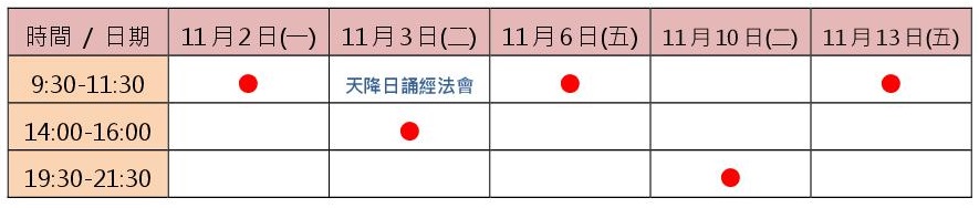 ●因仁波切沒講完《密乘地道安立》,於11月2日(一)開始,將繼續密集上完。時間如下: