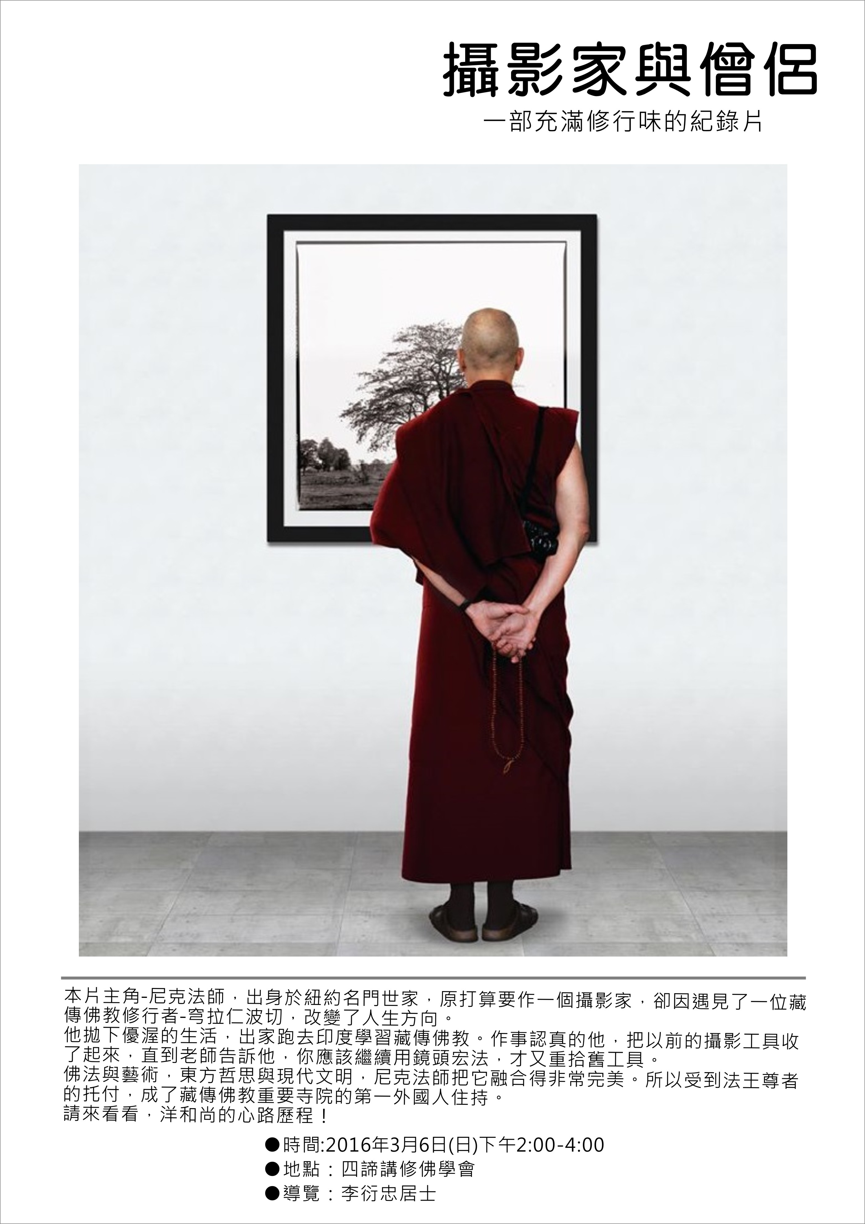 他拋下優渥的生活,出家跑去印度學習藏傳佛教。作事認真的他,把以前的攝影工具收了起來,直到老師告訴他,你應該繼續用鏡頭宏法,才又重拾舊工具。