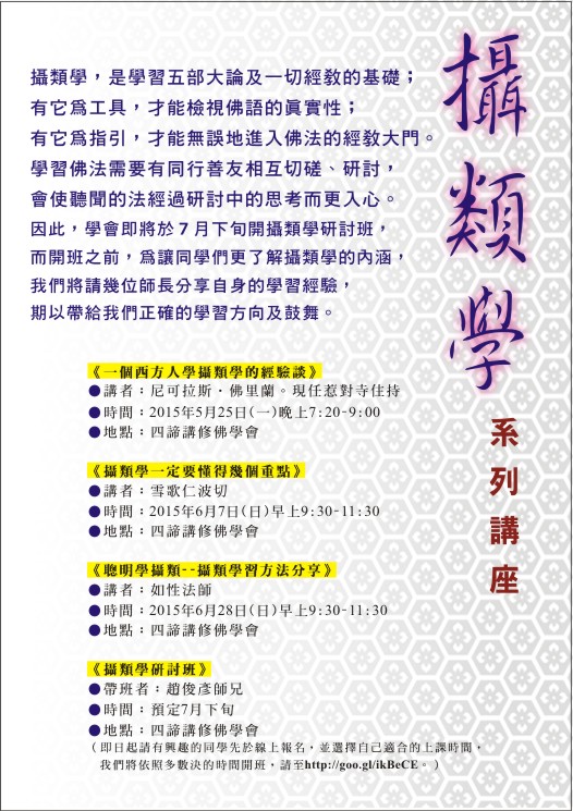 趙師兄已帶過多次攝類研討,深受好評。這次趙師兄將提供他經由雪歌仁波切審核過的講義為教材;此教材除了整理出仁波切講攝類學的精要,還加上圖表及生活化的例子做為輔助元素,讓學習者容易理解與記憶,不論是初學者或是想要溫故知新者都能受益良多。